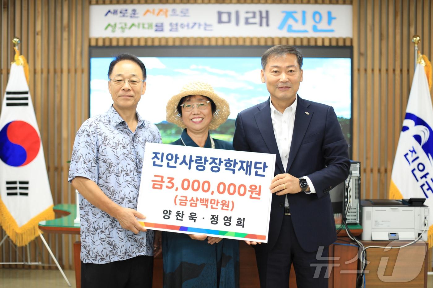 전북자치도 진안군 부귀면에 거주하는 양찬욱·정영희씨 부부(왼쪽)가 진안사랑장학재단에 장학금 300만원을 기부하고 있다.(찐안군제공)2024.7.23/뉴스1관련 키워드장학재단기부김동규 기자 진안군, 농업창업·주택지원 대상자 모집…연 2% 대출 금리이원택 의원 "전북을 에너지 특화한 국제도시로 조성"관련 기사"배움 열정 가진 사람 돕는 게 내 몫"…'33년째 조용한 기부' 이병학 씨라이나생명, '바랑재 드림 키친' 참가자 모집…한식 영셰프 육성윤하, 데뷔 22년만에 첫 리메이크 앨범…2월 선공개곡 공개이부진 두을장학재단 이사장, 졸업 후에도 지원…여성 인재 적극 양성진안사랑장학재단 "정일범 씨, 공연 수익금 1천만원 기부"
