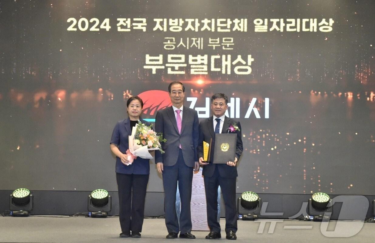 국무총리 기관 표창, 인센티브 사업비 8500만원 확보2021년 우수상 이어 올해까지 4년 연속 수상 영예정성주 김제시장(맨 오른쪽)이 한덕수 국무총리(가운데)로 부터 일자리 대상을 수상하고 있다.(김제시 제공)2024.8.8/뉴스1관련 키워드김제시일자리국무총리대상김재수 기자 '군산사랑상품권' 내년 3000억 규모 발행…1월 2일부터 판매'특장차 중견기업' 수성특장, 김제지평선산단에 둥지 튼다관련 기사행안부, 강원도 등 인구감소 대응 우수사례 13곳 선정전북자치도, 인구감소 위기 극복 위해 1천억대 기금 투입정성주 김제시장 "더 특별한 내일, 기회 도시 김제 만들겠다"