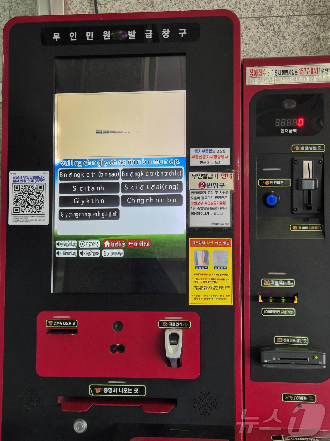 시청 무인민원발급기 중국·일본·베트남·필리핀어 지원주민등록등·초본, 가족관계증명서 등 발급 시 이용가능군산시가 시청에 설치된 무인발급기에서 4개 외국어 서비스를 지원하고 있다.(군산시 제공) 2024.9.27/뉴스1관련 키워드군산시무인민원발급기외국어지원이민자언어장벽김재수 기자 김제시의회·시민연대 "새만금신항 기본계획 유지하라"국립군산대 18년 연속 등록금 동결…4년제 일반대학 중 최저 수준