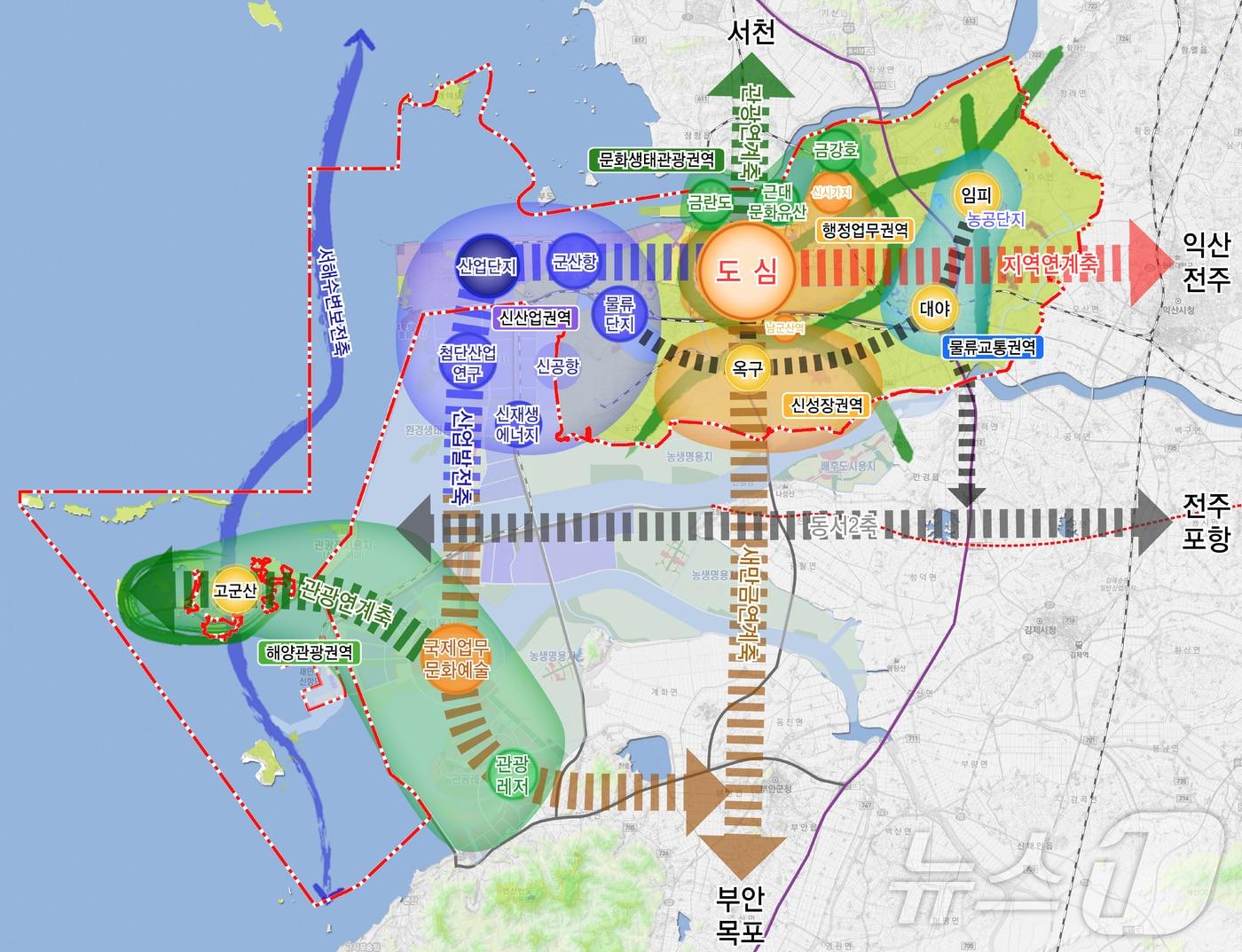 최근 여건변화 반영해 압축·재생 방향으로 수립공간 범위 새만금 사업지역 제외한 667㎢ 대상군산시가 밝힌 2040년 도시공간 구조 구상도. 2024.10.15/뉴스1관련 키워드군산시도시기본계획밑그림자립도시계획인구김재수 기자 김제시의회·시민연대 "새만금신항 기본계획 유지하라"국립군산대 18년 연속 등록금 동결…4년제 일반대학 중 최저 수준관련 기사"아이 성장하고 청년 머무는 도시로"…군산시, 인구정책 밑그림 그린다