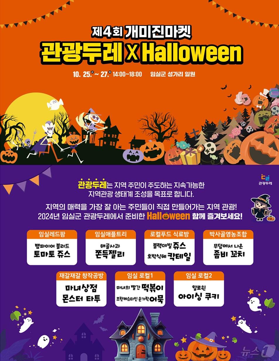 전북자치도 임실군 관광두레협의회는 25~27일 임실창고 1964 카페 일원에서‘개미진마켓×Halloween’을 운영한다.(임실군제공)2024.10.24/뉴스1관련 키워드관광두레김동규 기자 "촘촘한 노인복지 정책 협력"…김관영 전북지사, 임실군 방문진안군, 농업창업·주택지원 대상자 모집…연 2% 대출 금리관련 기사충주 관광두레 경쟁력 입증…최우수 피디·으뜸두레 연속 선정강릉시 "'로컬푸드·농업기계' 혁신으로 활력 넘치는 농촌 조성"광주 남구 "근대의상 키링, 정부 기념품으로 출시"영암관광두레, 문체부 전국대회서 장관상 수상광주대 RISE사업단 창업동아리, 문체부장관상 '대상'