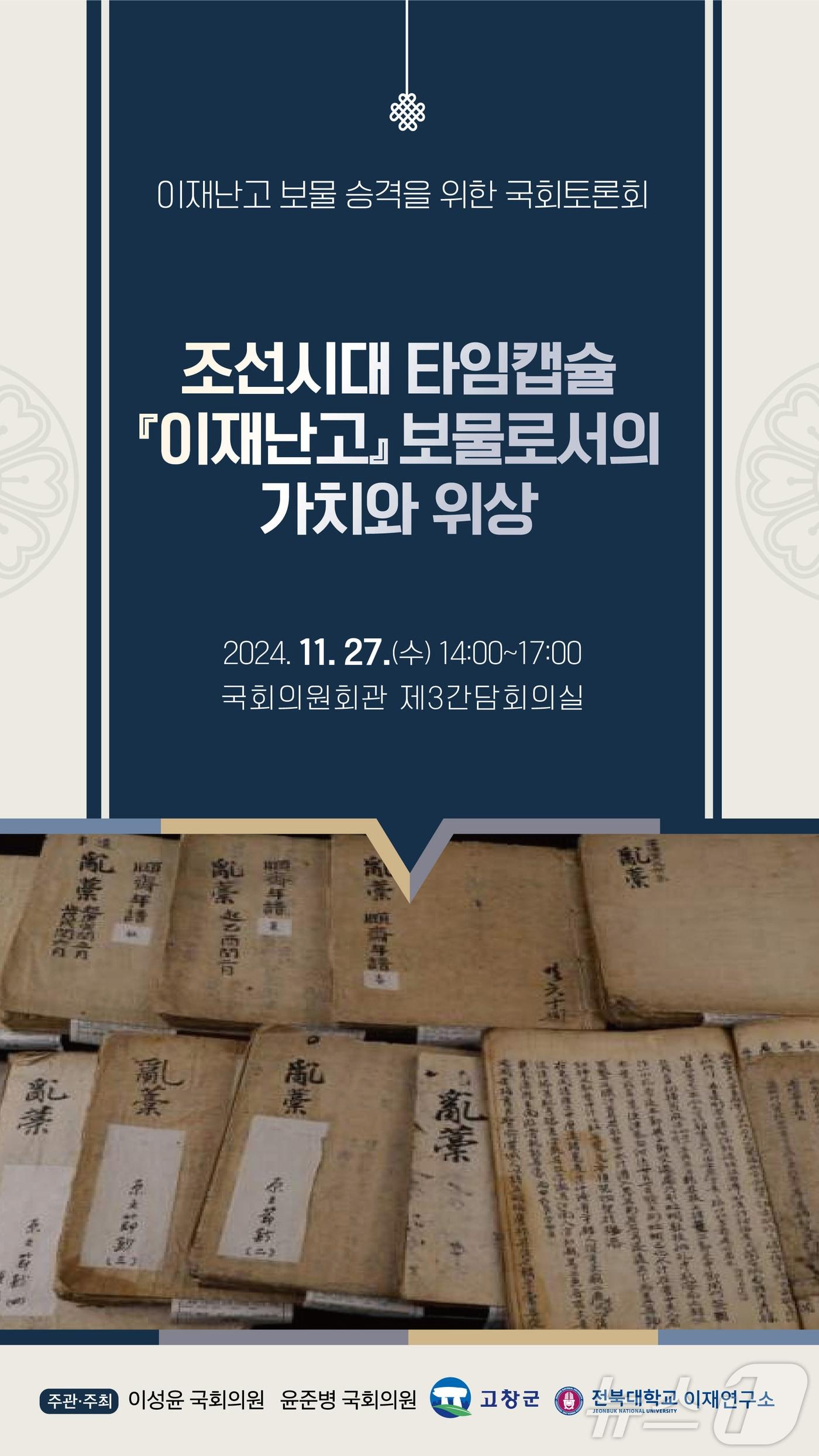 고창출신 이성윤·윤준병 의원 등 공동 주최'이재난고 보물승격을 위한 국회 토론회' 포스터(고창군 제공)2024.11.24/뉴스1 관련 키워드이재난고보물승격 토론회고창출신 이성윤 국회의원윤준병 국회의원