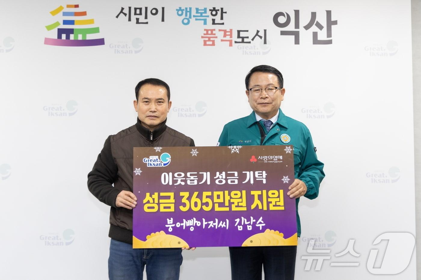 익산의 붕어빵 아저씨로 불리는 김남수 씨(왼쪽)가 올해도 365만원을 어려운 이웃들을 위해 써달라고 기탁했다.(익산시 제공) 2024.12.31/뉴스1관련 키워드김남수붕어빵아저씨익산장수인 기자 2층 주택서 떨어진 유리문…군인이 몸 던져 행인 구하고 부상"사육·가공·유통 생태계 갖춰"…익산시, '치킨벨트 거점 지정' 건의관련 기사익산 붕어빵아저씨 김남수 씨, 14번째 따뜻한 기부익산 붕어빵아저씨 김남수 씨, 산불 피해 지역에 100만원 기탁