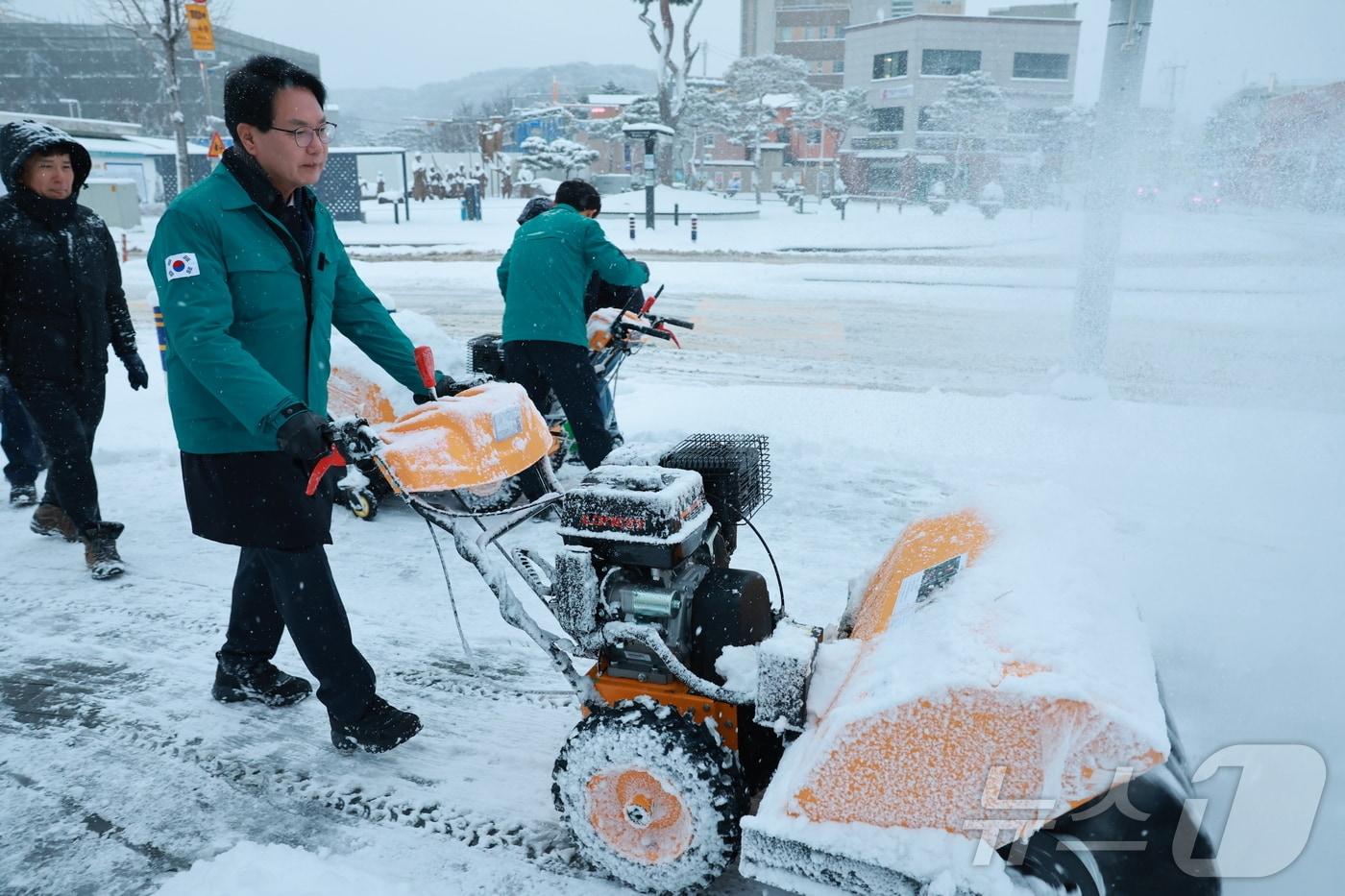 고창군이 13개 면지역 전체에 인도형 제설기 13대를 추가로 보급해 제설작업에 나섰다. 심덕섭 군수가 인도용 제설기를 이용해 눈을 치우고 있다.(고창군 제공)2025.1.8/뉴스1 관련 키워드고창군 인도용 제설기 추가 구입
