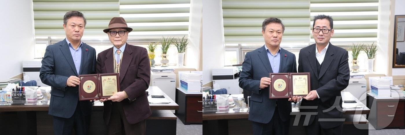 조무하 씨, 근현대사 미술품 등 1천여점 기증 공로 정읍시는 시립미술관에 귀중한 예술 작품을 기증한 조무하(서울·왼쪽) 씨와 유성길(정읍) 씨에게 감사패를 전달했다.(정읍시 제공)2025.1.9/뉴스1관련 키워드정읍시조무하(서울) 씨와 유성길(정읍) 씨 감사패