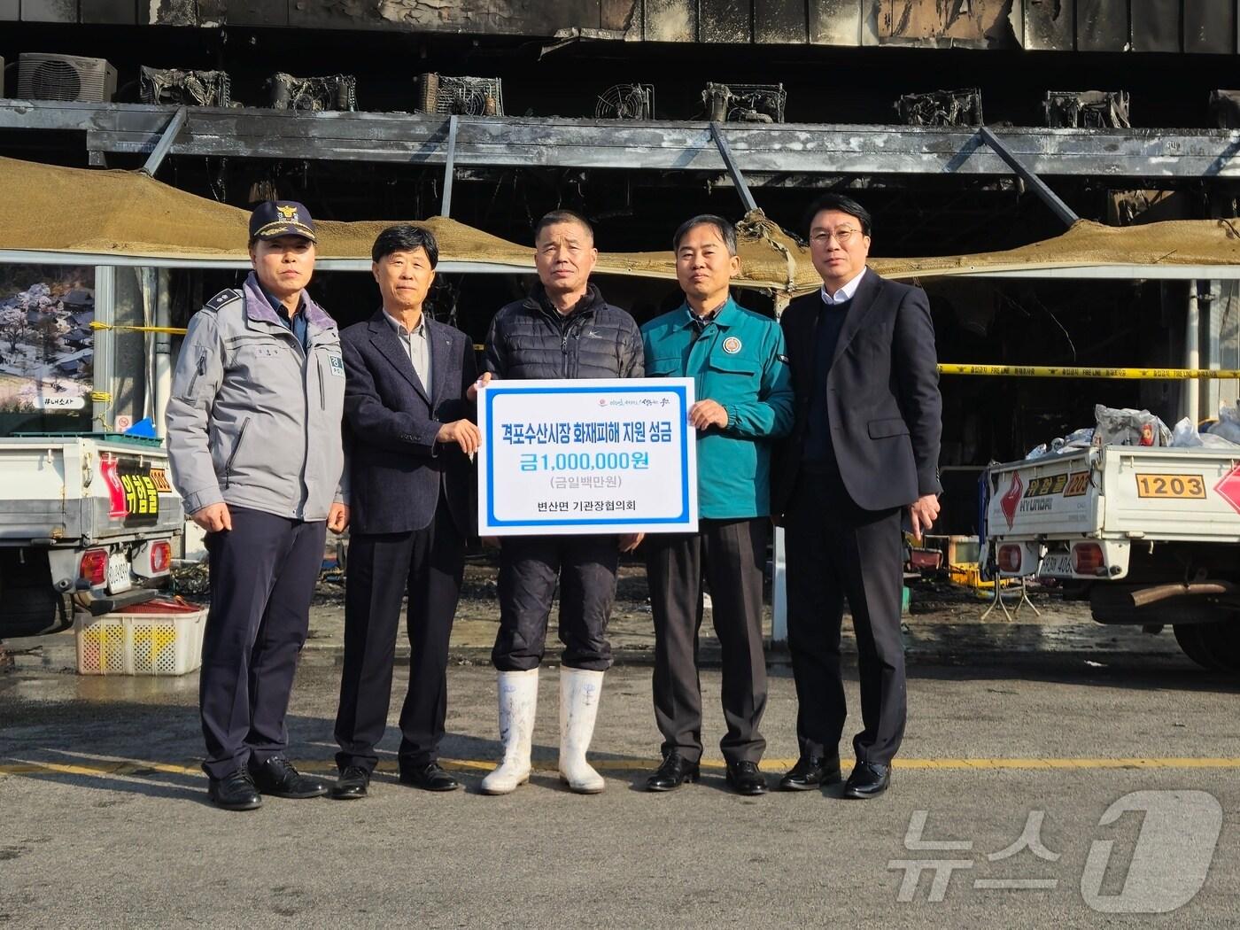 부안군 변산면 기관장협의회가 최근 화재로 큰 피해를 입은 격포항 수산시장 상인들을 돕기 위해 성금 100만원을 전달했다.(부안군 제공)2025.1.25/뉴스1관련 키워드부안군격포 수산시장 화재변산면기관장협의회