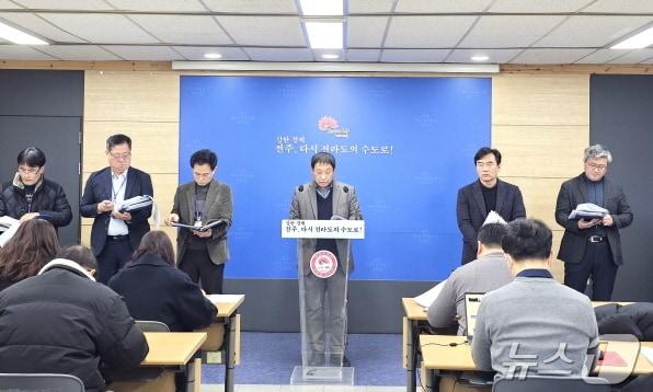 전주시 광역도시기반조성실 신년 브리핑김문기 전주시 광역도시기반조성실장이 11일 신년 브리핑을 갖고 올해 역점사업을 설명하고 있다.(전주시 제공)/뉴스1관련 키워드전주시김문기 실장광역도시기반조성실임충식 기자 "주차 숨통" 전주 서부신시가지 유휴부지에 임시주차장 조성전북교육감 출마 예정자들 일제히 천호성 '표절 논란' 비판(종합)관련 기사전주시 국장급 인사단행…기획조정실장에 최현창 부이사관