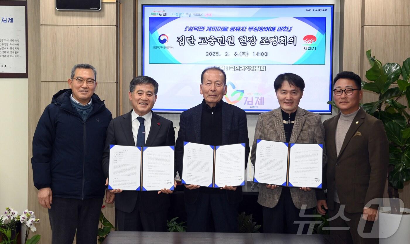 김제시-국민권익위, 공유지 개미마을 주민들에게 매각키로 합의점사용 공유지 1000만원 미만은 '개별공시지가', 이상 '감정평가'전북 김제시와 국민권익위원회가 지난 6일 김제시청에서 성덕면 개미마을 주민들의 집단고충민원 현장조정회의를 갖고 있다.(김제시 제공. 재판매 및 DB금지)2025.2.13/뉴스1관련 키워드김제시국민권익위집단고충민원현장조정회의강제이주김제시개미마을공유지취득김재수 기자 김제시의회·시민연대 "새만금신항 기본계획 유지하라"국립군산대 18년 연속 등록금 동결…4년제 일반대학 중 최저 수준