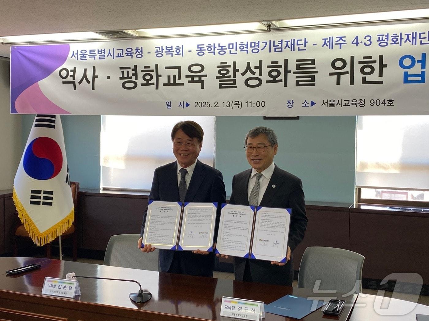 올바른 역사관 함양과 내실 있는 교육 활동 지원 위해 마련 동학농민혁명기념재단(이사장 신순철·왼쪽)이 학생들에게 올바른 역사관과 인권·평화 정신을 심어주기 위해 서울특별시교육청(교육감 정근식)과 13일 업무협약(MOU)을 맺었다.(기념재단 제공. 재판매 및 DB금지)/뉴스1관련 키워드동학농민혁명기념재단서울특별시교육청