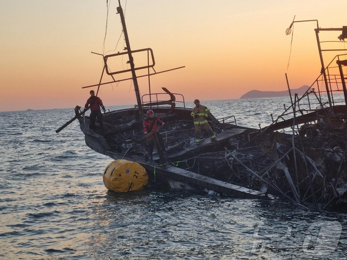 전북 부안군 왕등도 인근 해역에서 화재로 침몰한 신방주호 인양이 난항을 겪고 있다.(부안해경 제공. 재판매 및 DB금지) 2025.2.23/뉴스1관련 키워드부안 신방주호선박 화재인양관련 기사'5명 실종' 부안 신방주호 인양, 16일 이후 잠정 중단신방주호 실종자 일주일째 수색…부안해경 "반경 40㎞ 확대"부안 신방주호 실종자 수색 엿새째…"풍랑특보로 난항"기상 악화에 신방주호 실종자 수색 난항…선박 인양도 지연