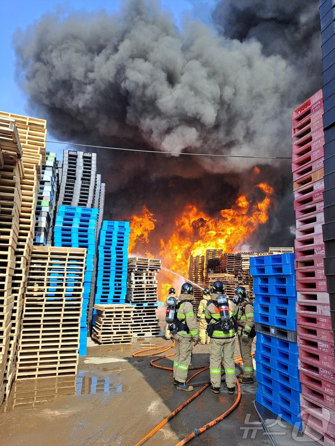 소방 장비 43대, 인력 120명 투입26일 오전 11시 18분께 전북자치도 김제시 성덕면 한 야적장에 있던 플라스틱 팔레트(화물 운반대)에서 불이 났다.(전북소방 제공. 재판매 및 DB금지) 2025.2.26/뉴스1 관련 키워드김제 소방야적장 화재관련 기사김제 성덕면 야적장서 불…소방 진화 중