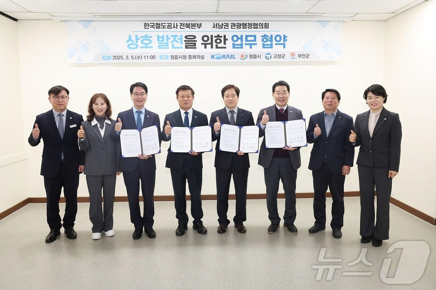 '정읍·고창·부안' 서남권 관광행정협의회전북자치도 서남권 3개 시·군(정읍·고창·부안)과 한국철도공사 전북본부가 상호협력을 위해 맞손을 잡았다.(정읍시 제공. 재판매 및 DB금지)2025.3.5/뉴스1 관련 키워드전북 서남권 관광행정협의회코레일코레일 전북본부관련 기사[오늘의 일정] 전북(5일, 수)
