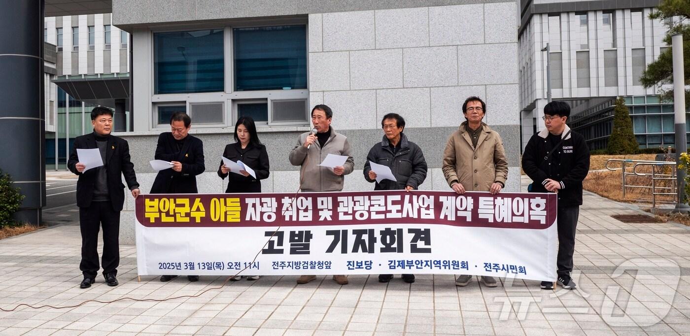 권익현 군수 "아들 정식 채용 절차로 취업"…자광 "인사·채용 절차 준수"진보당 김제부안 지역위원회와 전주시민회는 13일 전주지검 앞에서 기자회견을 열고 "검찰은 권익현 부안군수와 전은수 자광홀딩스 대표 사이에 벌어진 뇌물수수 의혹을 철저히 수사하라"고 촉구했다.(2025.3.13)/뉴스1관련 키워드부안군권익현 군수자광자녀 취업 특혜의혹전주지검기자회견강교현 기자 자광, 다음 달 11일 전주 옛 대한방직 부지서 '비전 페스타'국영석 전 도의원, 완주군수 출마 "초일류 자족도시 완성할 것"관련 기사'자치분권의 힘으로 새로운 전북' KDLC전북 신년인사회 개최KDLC전북 "자치분권으로 발전방향 모색"…내달 신년인사회'아듀 2025' 부안 변산해수욕장서 31일 해넘이축제부안군, 74년 만에 6·25전쟁 故이만석 대위 유가족에 '무공훈장'경찰, '자녀 취업 특혜 의혹' 부안군수 불송치 결정
