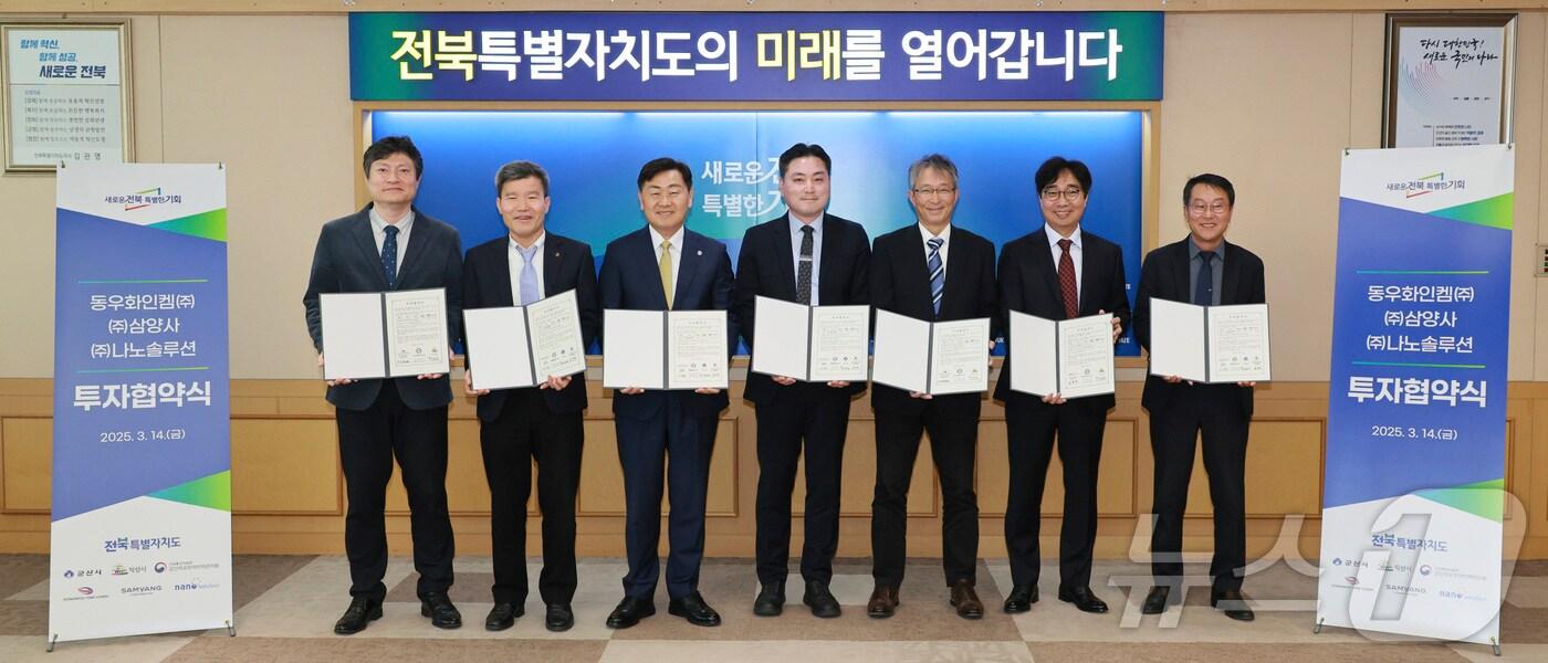 동우화인켐·삼양사·나노솔루션과 협력…847억 규모 투자 유치반도체·정밀화학·이차전지 소재 산업 집중 육성14일 전북자치도청 회의실에서 첨단소재기업 투자협약식이 열린 가운데 참석자들이 기념 촬영을 하고 있다.(전북자치도 제공. 재판매 및 DB 금지)/뉴스1유승훈 기자 '2년 연속 불발' 김관영 전북지사 완주군 방문, 이번엔 성사되나[오늘의 날씨] 전북(17일, 토)…구름 많다가 오전부터 맑아져