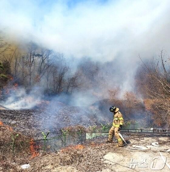 22일 오후 1시 52분께 전북자치도 진안군 안천정수장 뒤편 야산에서 산불이 발생했다.(전북소방본부 제공, 재판매 및 DB 금지)/뉴스1유승훈 기자 김관영 "윤석열 징역 5년, 단죄 시작…형량 너무 아쉬워""도로·의료·복지 전방위 지원"…순창 발전 협력 청사진 밝힌 전북도