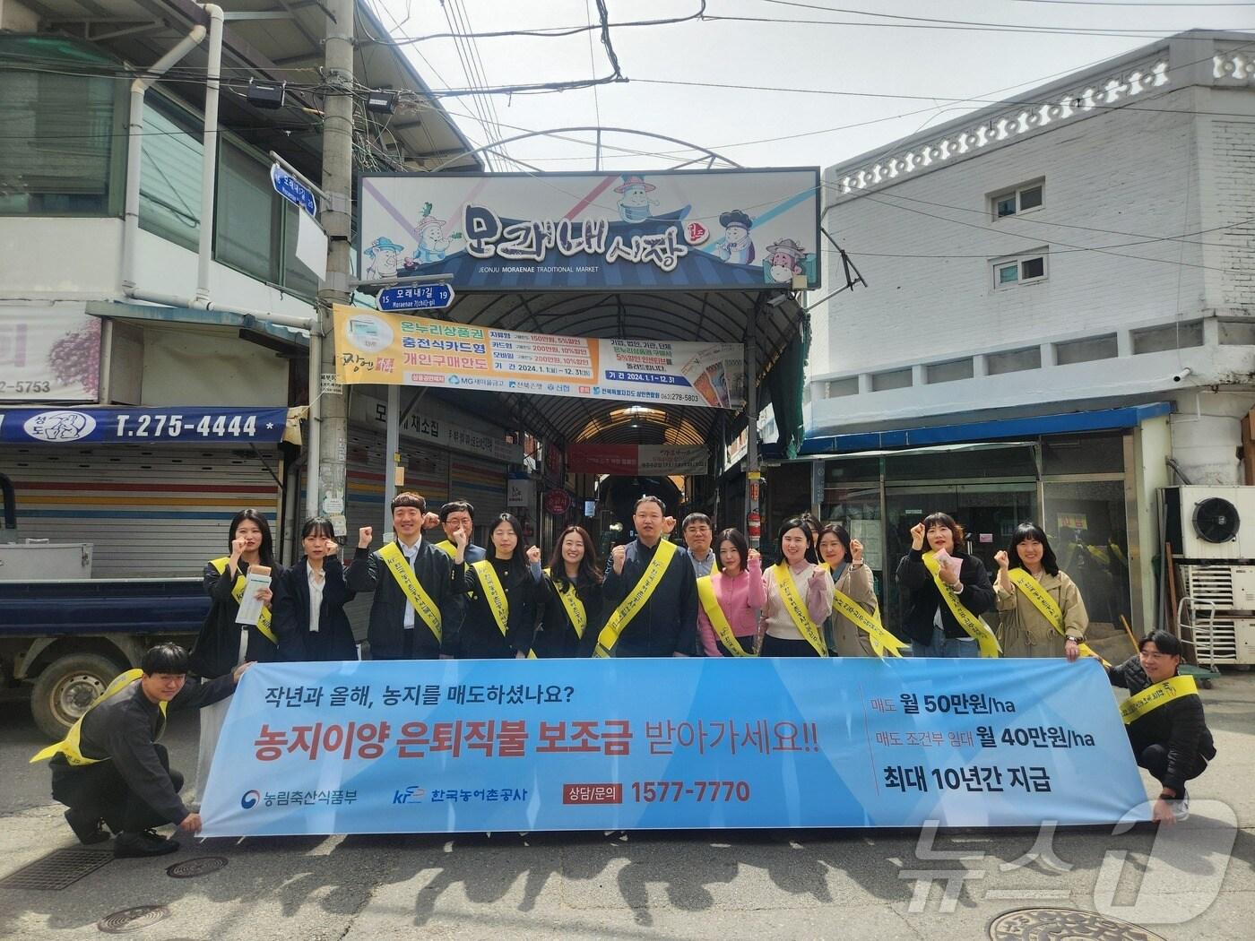한국농어촌공사 전북지역본부는 전주 모래내시장에서 '농지이양 은퇴직불사업' 홍보 활동을 펼쳤다고 25일 밝혔다. (공사제공. 재판매 및 DB금지)2025.3.25/뉴스1관련 키워드농어촌공사전북지역본부농지이양 은퇴직불사업강교현 기자 장수군, 농작업 재해 예방…안전컨설팅 참여자 모집자광, 다음 달 11일 전주 옛 대한방직 부지서 '비전 페스타'