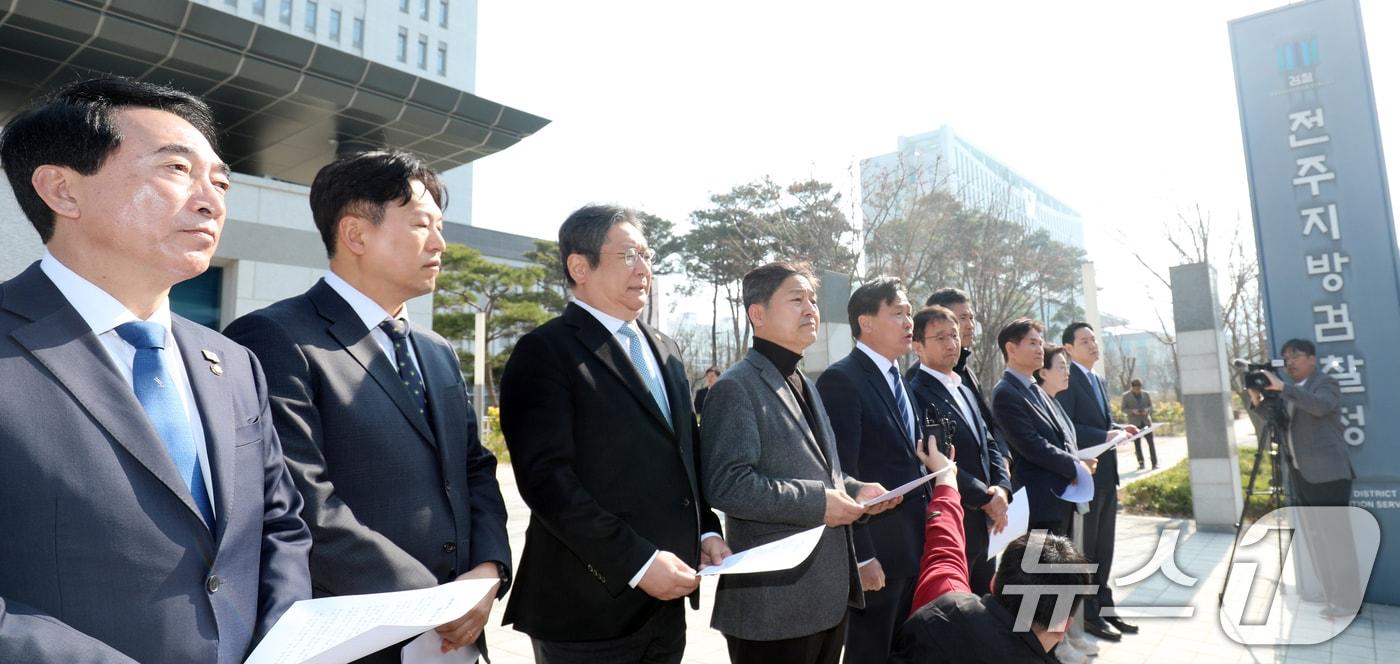 민주당 전정권정치탄압대책위원회, 항의 방문더불어민주당 '전 정권 정치탄압대책위원회' 의원들이 1일 전북자치도 전주시 전주지검 앞에서 문재인 전 대통령에 대한 정치 탄압 수사 중단을 촉구하고 있다. 2025.4.1/뉴스1 ⓒ News1 유경석 기자관련 키워드전주지검민주당전정권정치탄압대책위원회강교현 기자 장수군, 농작업 재해 예방…안전컨설팅 참여자 모집자광, 다음 달 11일 전주 옛 대한방직 부지서 '비전 페스타'관련 기사공수처, 文 '전주지검 검사들 고발' 사건, 수사1부 배당文 전 대통령, 뇌물죄 수사검사 공수처에 고발…전주지검 "유감"文·민주, 검찰 뇌물죄 기소에 이창수 중앙지검장 등 공수처 고발文 기소에 격분…민주 '해체 수준' 검찰개혁 칼 간다민주 "尹정치검찰 최후 발악"…국힘 "文, 용서 못할 중죄"(종합)