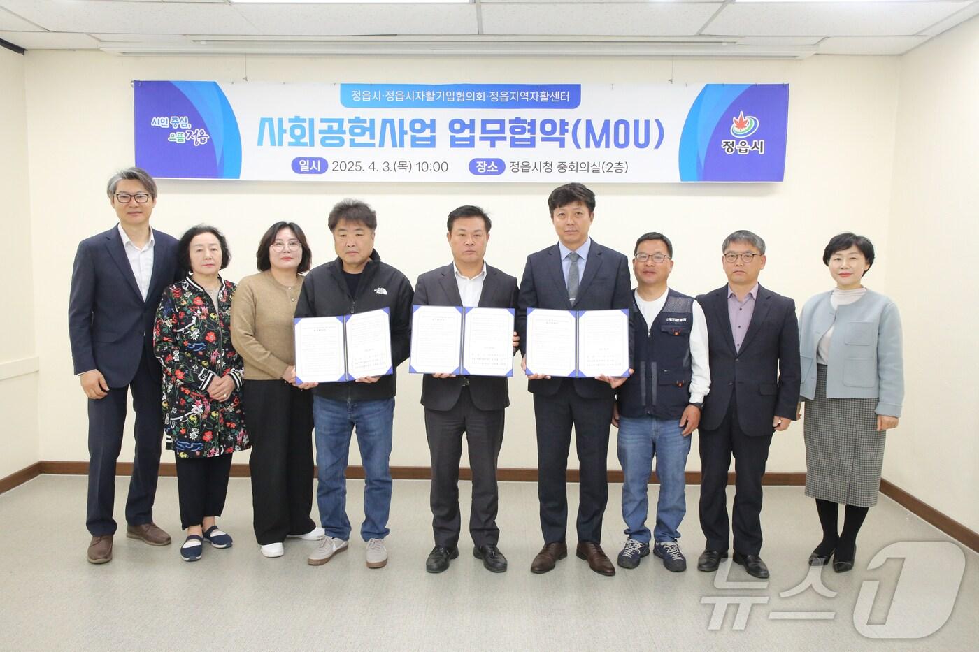 정읍시가 지역 내 저소득 취약계층을 위한 복지 강화를 위해 정읍시자활기업협의회(회장 장우현), 정읍지역자활센터(센터장 김현철)와 사회공헌사업 업무협약을 맺었다.(정읍시 제공. 재판매 및 DB금지) 관련 키워드정읍시자활기업협의회(회장 장우현)정읍지역자활센터(센터장 김현철)