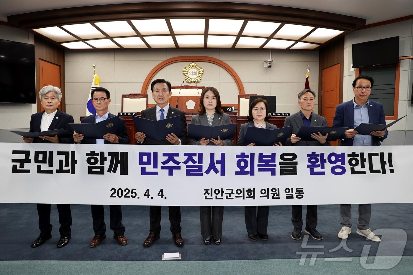 4일 전북자치도 진안군의회가 윤석열 대통령 파면을 환영하고 있다.(의회제공. 재판매 및 DB금지)2025.4.4/뉴스1관련 키워드탄핵김동규 기자 "촘촘한 노인복지 정책 협력"…김관영 전북지사, 임실군 방문진안군, 농업창업·주택지원 대상자 모집…연 2% 대출 금리관련 기사尹 '체포 방해' 등 징역 5년 선고에 울산시민 반응 엇갈려[일지] 12·3 계엄 선포부터 尹 '체포 방해' 1심 징역 5년 선고까지한동훈 제명에…국민의힘 광주전남 당원 엇갈린 반응성일종 "한동훈 징계, 당내 갈등 키워선 안돼" 자제·타협 촉구고공농성 336일 만에 땅 디딘 세종호텔 해고 노동자…"복직 투쟁 계속"