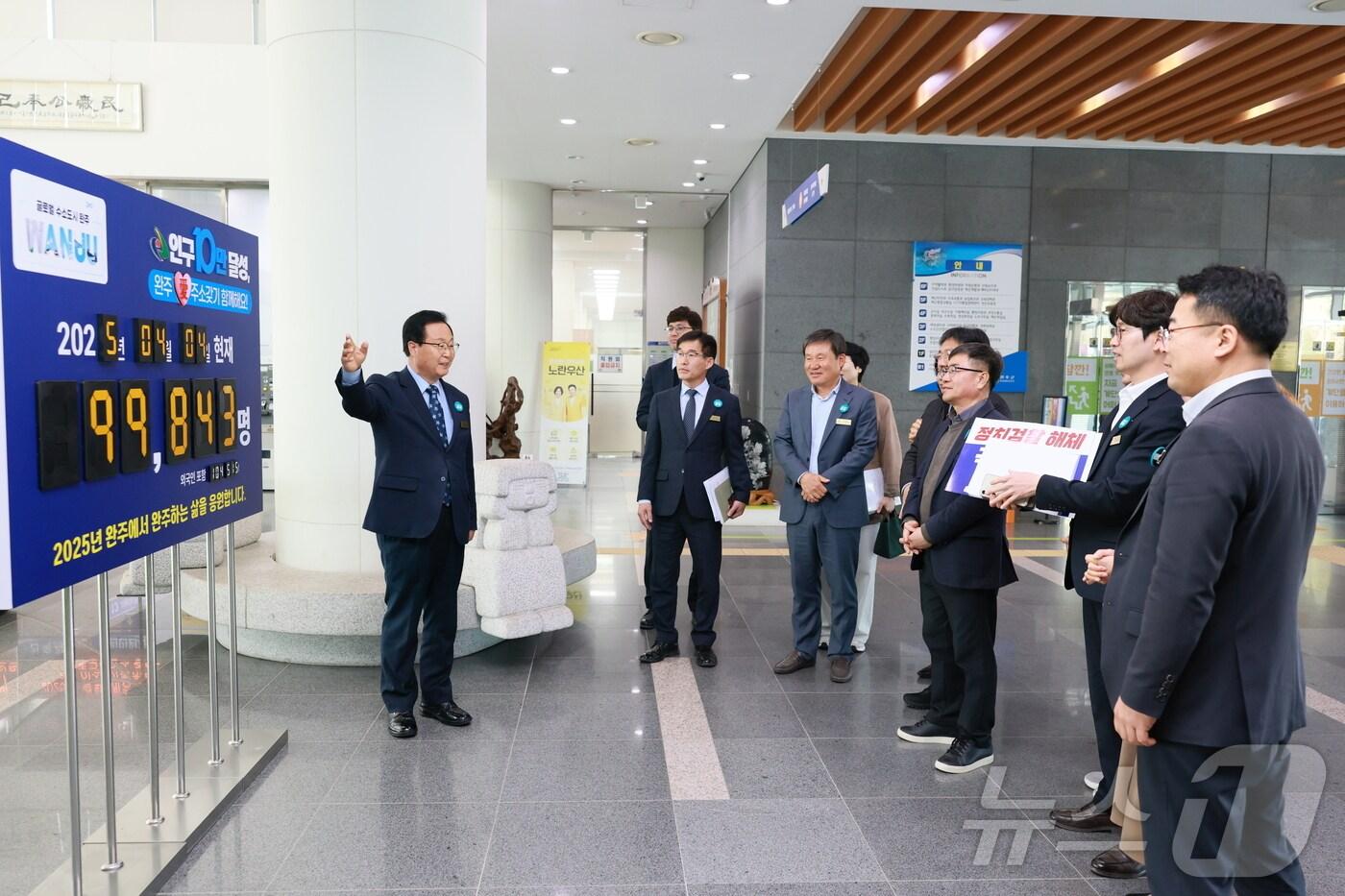 4일 기준 9만843명…157명 남아전북 완주군은 '인구 10만 달성' 현황판을 군청 로비 1층에 설치했다고 4일 밝혔다.(완주군 제공. 재판매 및 DB금지)2025.4.4/뉴스1관련 키워드완주군10만 인구인구현황판강교현 기자 장수군, 농작업 재해 예방…안전컨설팅 참여자 모집자광, 다음 달 11일 전주 옛 대한방직 부지서 '비전 페스타'