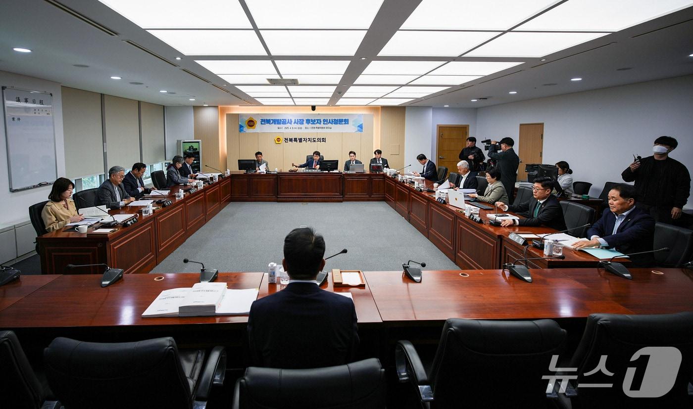 10일 경과보고서 채택 여부 결정9일 전북자치도의회 인사청무위원회가 김대근 전북개발공사 사장 후보자에 대한 도덕성과 전문성을 검증하는 청문을 하고 있다.(의회제공. 재판매 및 DB금지)2025.4.9/뉴스1관련 키워드인사청문회전북개발공사김동규 기자 임실군, 신장 장애 혈액 투석 환자 교통비 월 15만원 지원진안 청소년수련관, 성평등가족부 종합평가 '최우수 시설' 선정관련 기사용선중 전주관광재단 대표이사 후보자, 인사청문회 통과[뉴스1 PICK]'LH 대수술 예고'…김윤덕 "李 대통령, 적극적 개혁 주문"