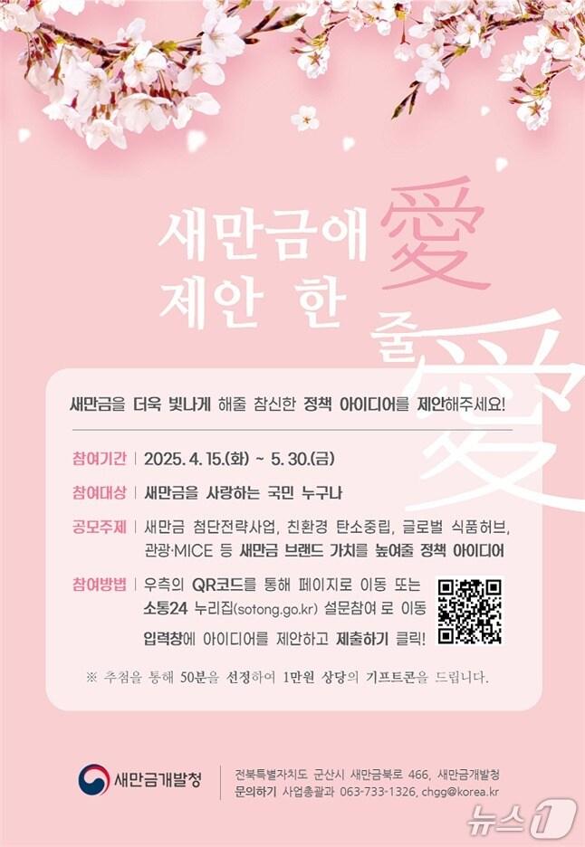 국민과 소통·공감 이끌 창의적 정책 아이디어 발굴새만금개발청의 '새만금애(愛) 한줄 제안' 공모전 홍포 포스터.(새만금개발청 제공. 재판매 및 DB금지)/뉴스1 유승훈 기자 [오늘의 날씨] 전북(17일, 토)…구름 많다가 오전부터 맑아져김관영 "윤석열 징역 5년, 단죄 시작…형량 너무 아쉬워"
