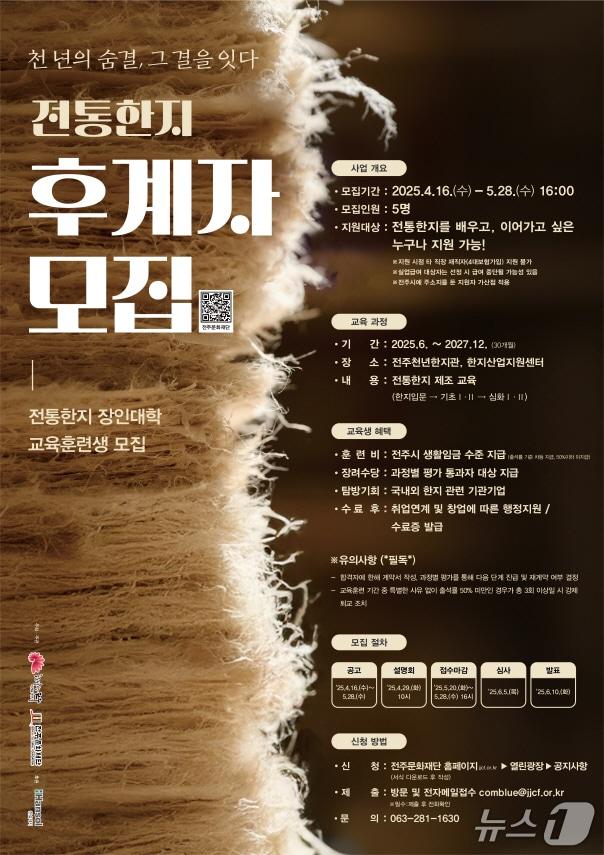 전통한지장인대학 교육훈련생 공개 모집…5명 선발해 지원전북자치도 전주시와 (재)전주문화재단이 전통한지 장인대학 교육훈련생을 공개 모집한다./뉴스1관련 키워드전주시전통한지 후계자 모집임충식 기자 전주 배 올해 첫 수출길…베트남 전역에 공급전주야구장·실내체육관 2027년 준공…우범기 시장 "속도 낼 것"