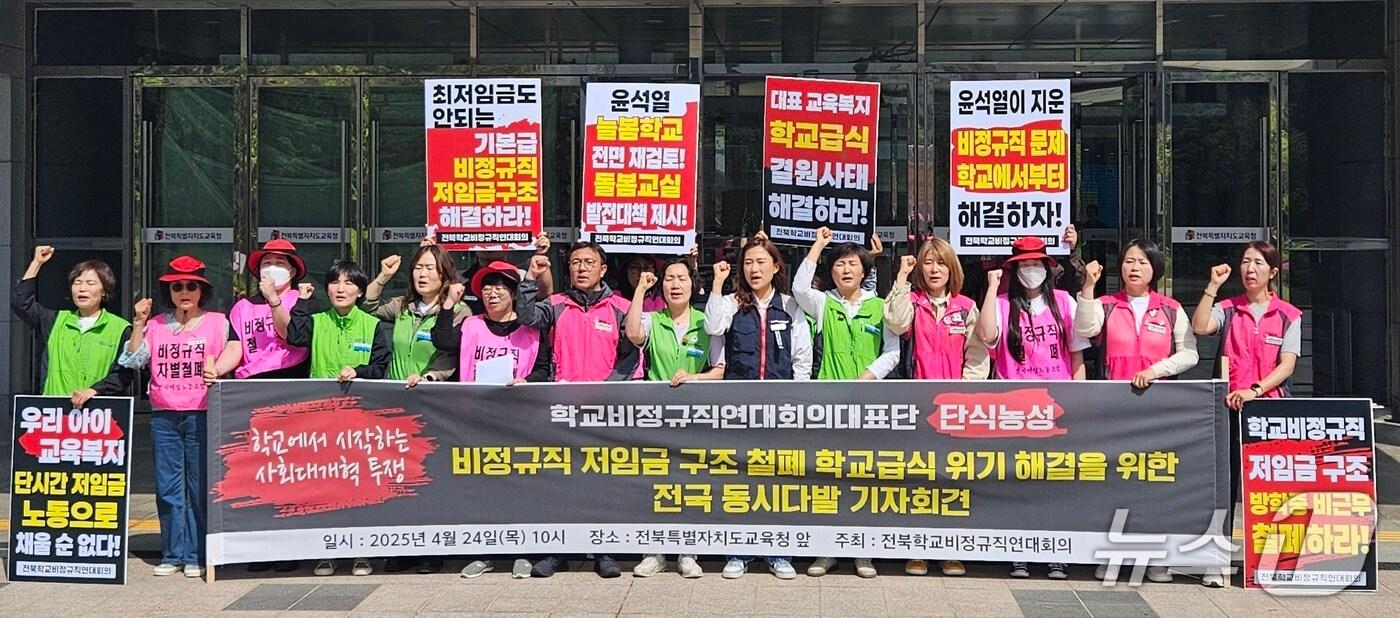 전북학교비정규직연대회의가 24일 전북특별자치도교육청 앞에서 기자회견을 열고 학교 비정규직의 저임금 구조와 급식 위기 해결을 촉구하고 나섰다. 2025.4.24/뉴스1 신준수 기자관련 키워드전북비정규직연대회의급식실관련 기사급식 중단 릴레이 멈출까…이번주 학교 비정규직·교육당국 재협상광주·전남·전북·제주 학교 40% 급식 차질…돌봄교실도 8.4% 중단학교 비정규직 총파업 이틀째…아이들은 오늘도 빵·우유(종합)[뉴스1 PICK]학교 비정규직 릴레이 총파업 돌입…'대체식 먹는 아이들'"방학이라고 월급 안주나"…전국 학교급식·돌봄 20~21일 총파업