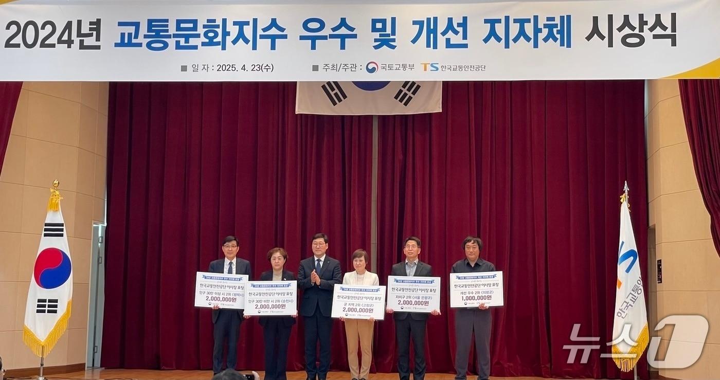 고창군이 국토교통부 '교통문화지수 우수 및 개선 지자체'로 선정돼 교통안전공단 이사장 표창을 받았다. 이희경(왼쪽 네번째) 고창군 도시디자인과장이 우수 지자체 상을 받고 기념사진을 찍고 있다.(고창군 제공, 재판매 및 DB금지)관련 키워드고창군국토부고통문화지수우수기관