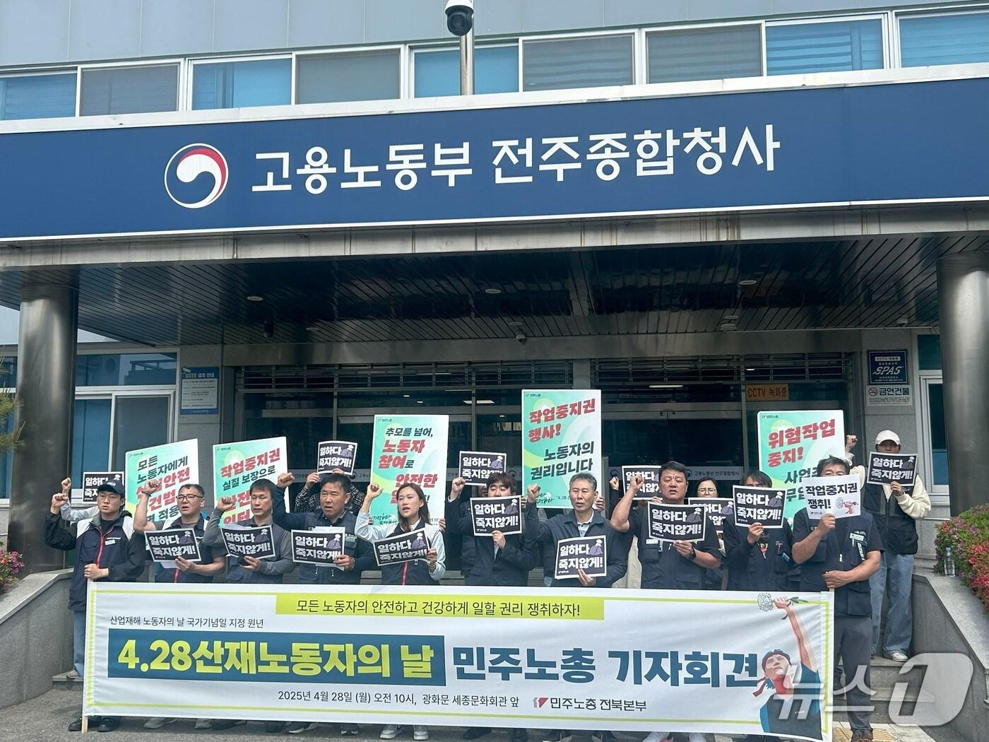 '산재 노동자의 날' 맞아 고용노동부 전주지청서 기자회견28일 '산재노동자의 날'을 맞아 민주노총 전북본부가 산재 사망자들을 기리고 노동자들의 권리 보장을 촉구하고 나섰다.(민주노총 제공. 재판매 및 DB금지)관련 키워드산재 노동자의 날민주노총관련 기사'세계 이주민의 날' 경남서도 "단속 추방 중단·권리 보장" 목소리서울역 모인 이주노동자들…"故 뚜안씨 죽음 책임져라"'쉬는 제도'라는 오해…상병수당 설계는 복귀까지 고려했다택배 노조 "쿠팡, 8·14 택배 없는 날 동참 안 하면 로켓배송 멈출 것"민주노총 충북 "충주 이차전지 업체 전반적인 안전점검 필요"