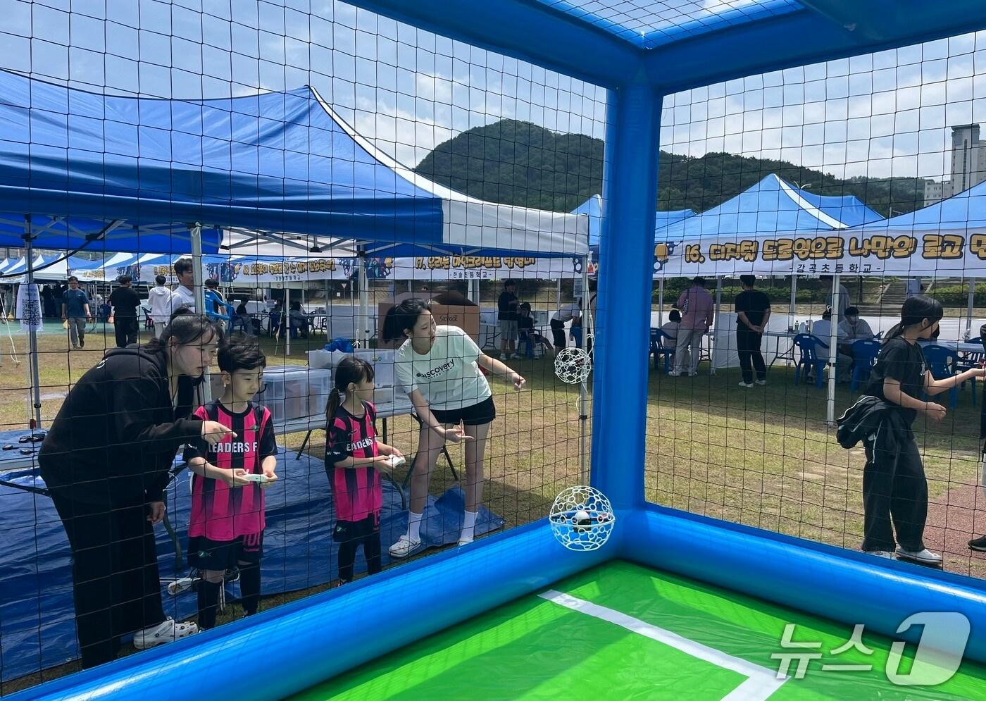 '2025년 정읍창의과학축전이 17~18일까지 이틀간 정읍시 천변 어린이전용 축구장에서 열린다. 행사에 참여한 어린이가 드론축구를 하고 있다.(정읍교육청 제공, 재판매 및 DB금지)