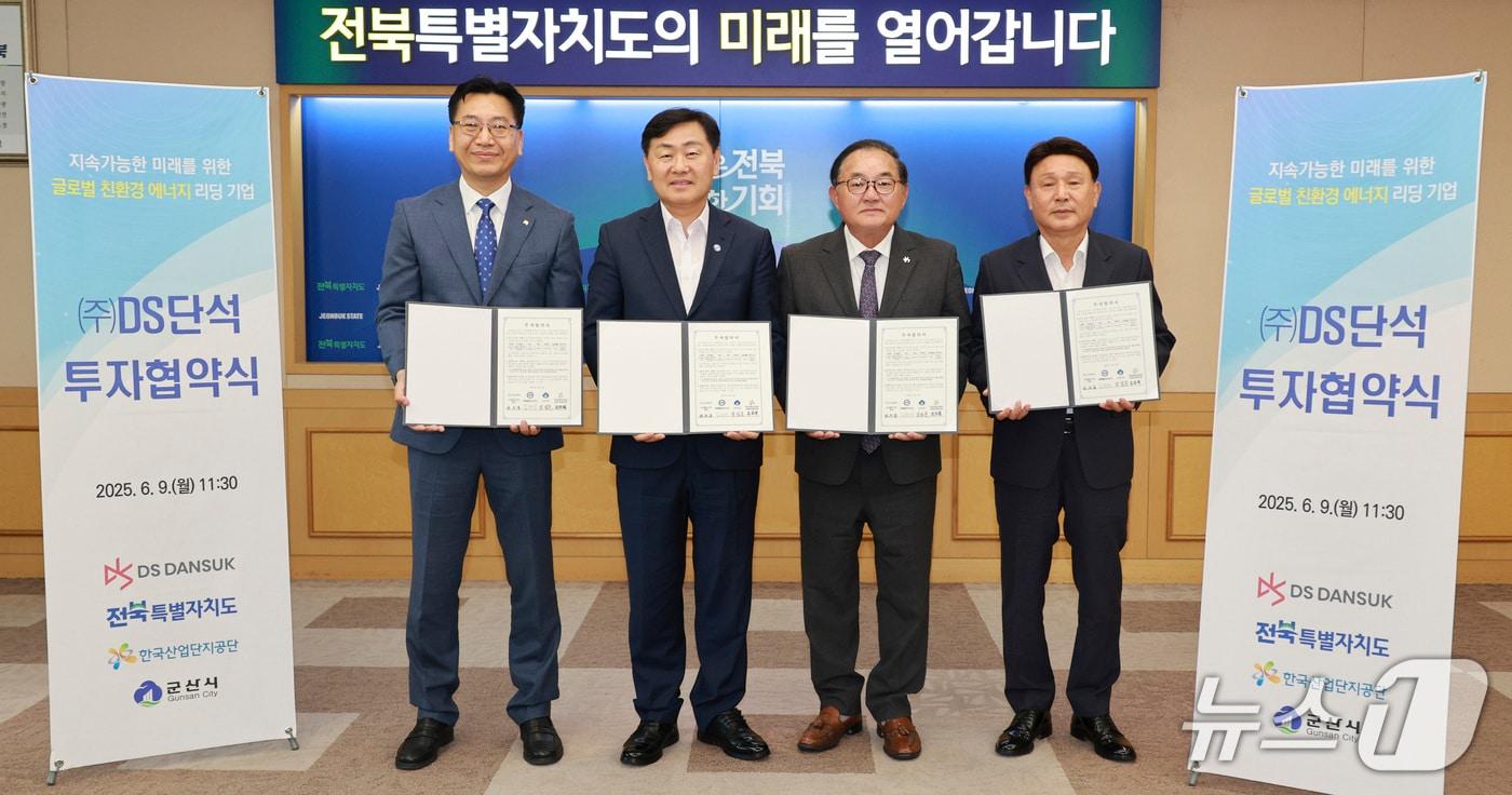 9일 전북도청에서 ㈜디에스단석 군산 국가산단 투자협약식이 개최된 참석자들이 기념 촬영을 하고 있다. 왼쪽부터 문문철 한국산업단지공단 전북본부장, 김관영 전북도지사, 한승욱 ㈜디에스단석 공동 대표, 강임준 군산시장 순.(전북도 제공. 재판매 및 DB금지)/뉴스1