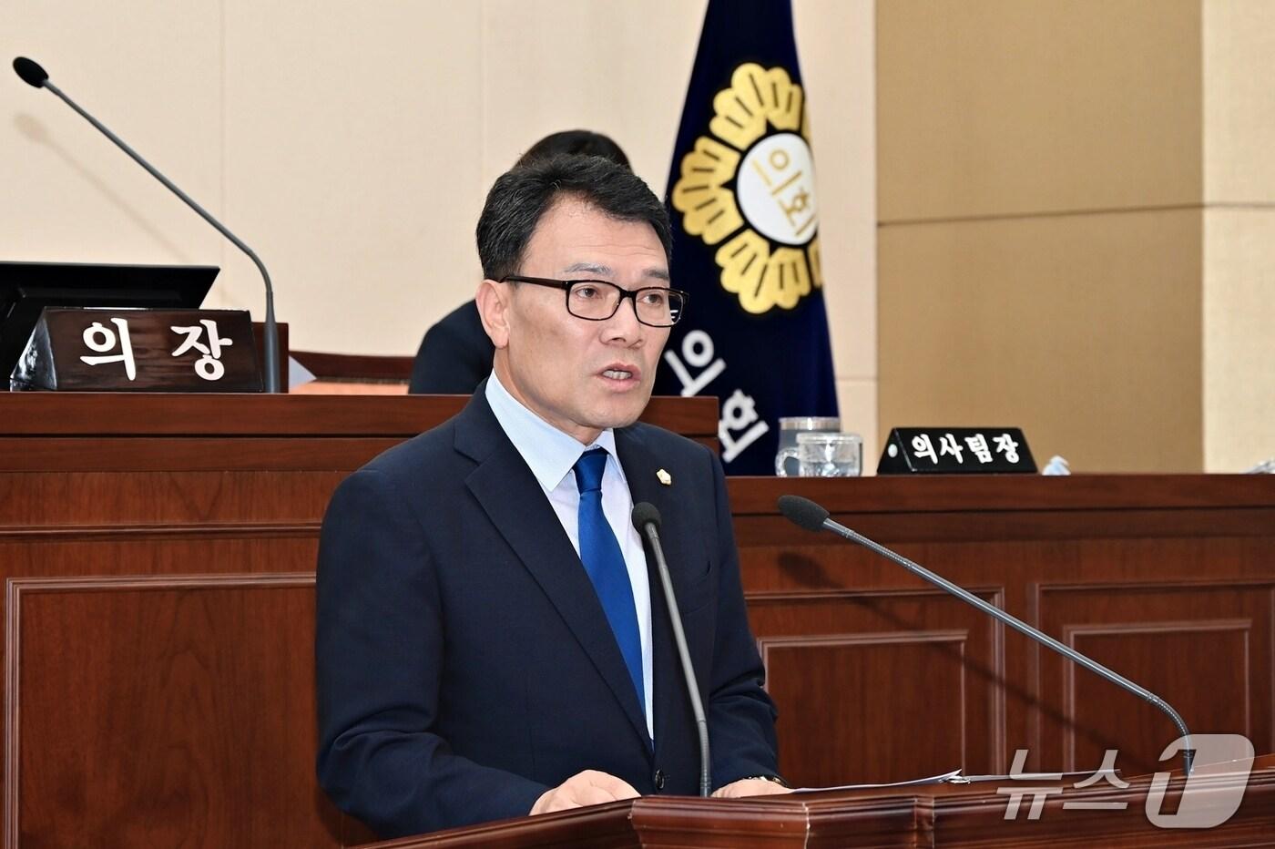 10일 열린 전북 남원시의회 제273회 정례회 제1차 본회의에서 강인식 의원이 ‘제22대 국회 공공의대 법안 통과 촉구 결의안’ 제안 설명을 하고 있다.(남원시의회 제공. 재판매 및 DB금지)/뉴스1