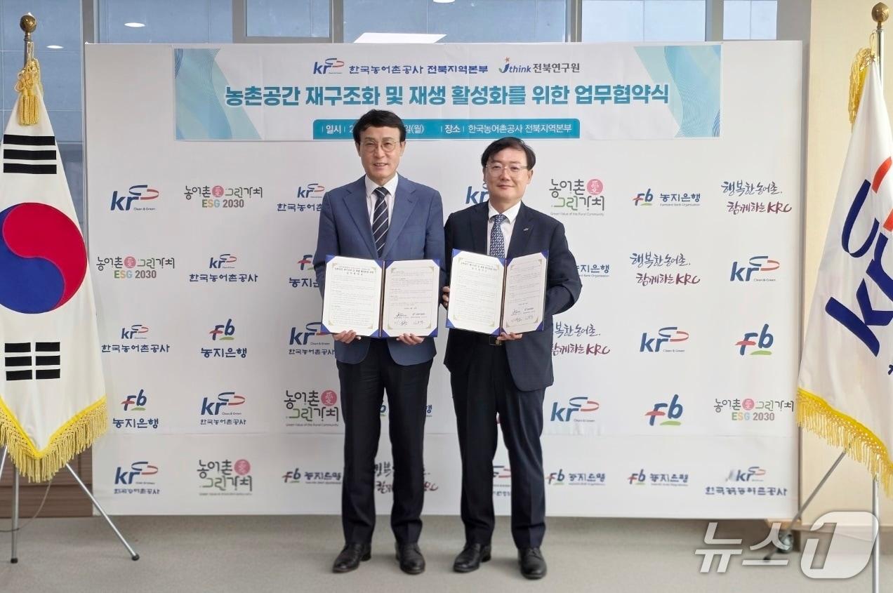 농어촌공사 전북지역본부와 전북연구원이 농촌 공간 재생 활성화를 위해 힘을 모으기로 했다.(농어촌공사 전북본부 제공. 재판매 및 DB금지)2025.6.16/뉴스1관련 키워드농어촌공사농어촌공사 전북지역본부전북연구원농촌정책 지원강교현 기자 "알파카 수입해줄게"…수천만원 가로챈 동물 수입업체 대표완주군, 스마트 경로당 100곳 구축…디지털 복지 확대관련 기사"전북도민 염원 하나로 모아 인공태양 연구시설 새만금 유치"