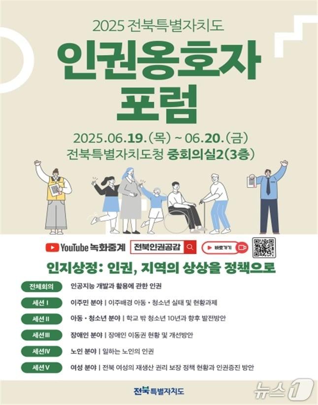 전북도청서 19~20일 이틀 간…전국 인권 전문가·활동가 참여인공지능과 인권의 조화…아동·장애인·노인 인권 의제까지 포괄2025 전북도 인권옹호자 포럼 포스터.(전북도 제공. 재판매 및 DB금지)/뉴스1 유승훈 기자 전북도 감사 행정, 전국 최고 평가…2년 연속 최우수전북서 'AI시대 바람직한 미래도시 조성 방안' 모색 컨퍼런스 열려