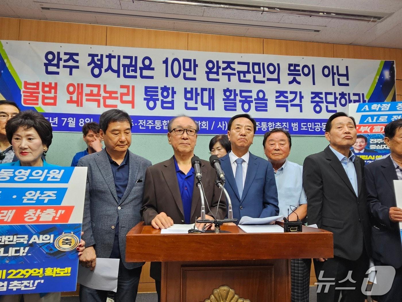 완주·전주통합추진연합회, 기자회견 갖고 완주 정치권 비판8일 완주·전주통합추진연합회가 전북도의회 브리핑룸에서 기자회견을 갖고 있다.2025.7.8/뉴스1관련 키워드통합정치권주민투표김동규 기자 [오늘의 날씨]전북(1일, 목)…최저 -12도, 서해안 등 저녁부터 눈전북기업 삼일씨엔에스, 일본 해상풍력 프로젝트 수주관련 기사35년 만에 대전·충남 재통합 이뤄질까?…공론화 과정 최대 과제충북시민단체 "대전·충남 행정통합 졸속 추진…중단해야"박완수 경남지사 "부산과 행정통합 최종 결정은 주민투표로"'대전·충남 통합' 인터넷카페서 85% 반대…"주민 공론화 필요"대전·천안아산경실련 "공론 과정 없는 통합 반대…주민투표 하라"