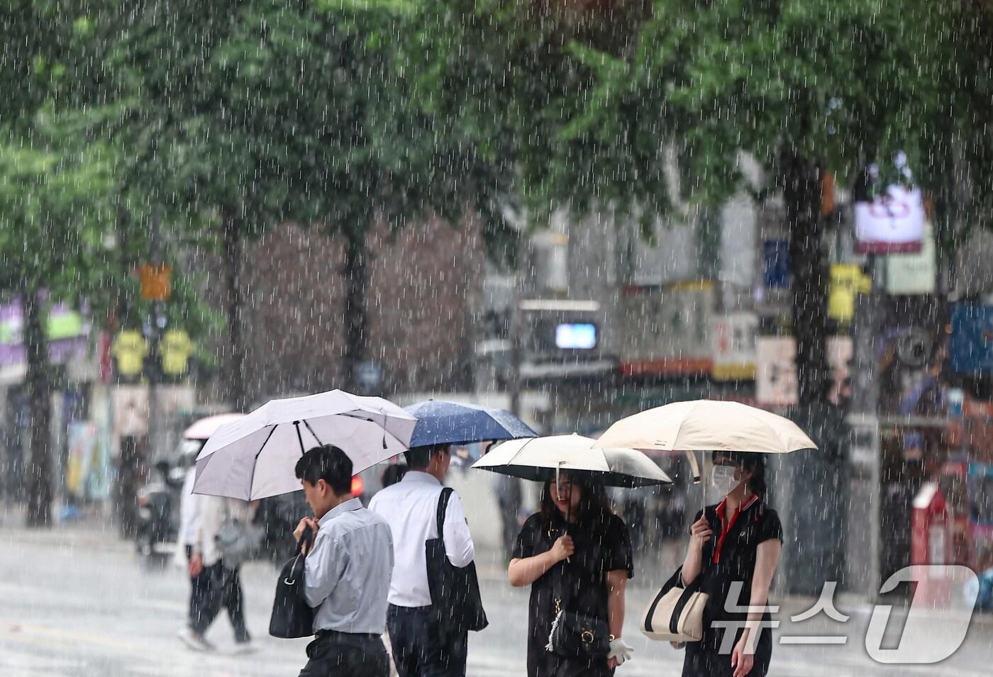 소나기가 내리는 8일 오후 서울 종로구 종각역 인근에서 시민들이 발걸음을 재촉하고 있다. 2025.7.8/뉴스1 ⓒ News1 김도우 기자