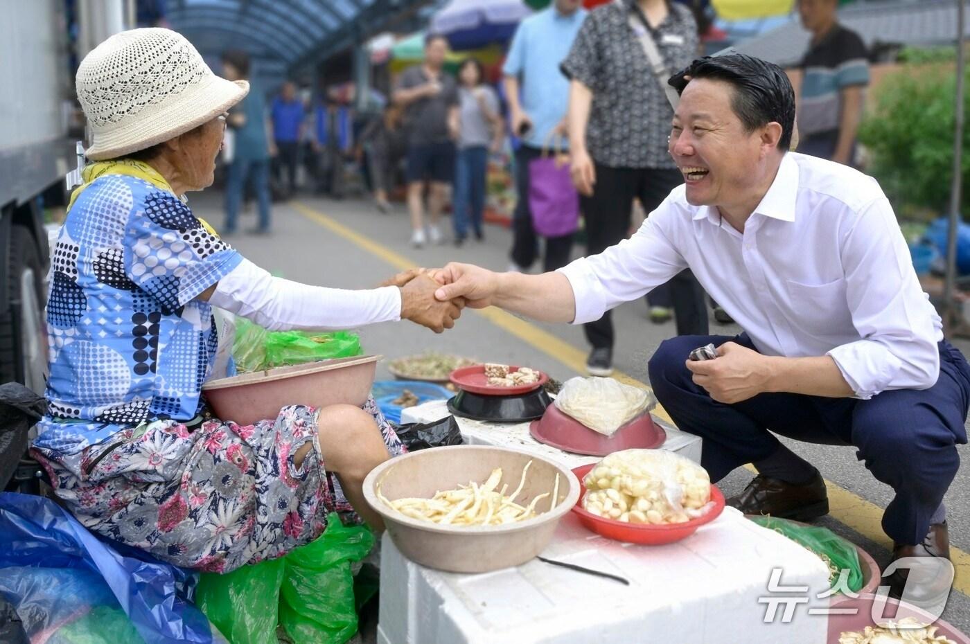 최영일 전북 순창군수가 재래시장에서 채소를 팔고 있는 어르신과 인사를 나누고 있다.(순창군 제공. 재판매 및 DB금지)/뉴스1