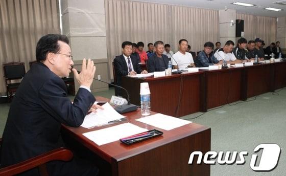 김완주 전북도지사는 19일 전북체육회관에서 도내 학교야구 지도자들과 함께 '유소년 및 학교 야구 활성화 방안'을 주제로 대화를 나눴다. (전북도 제공) 2012.9.19/뉴스1 © News1 김춘상 기자