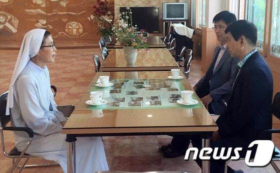 22일 온누리상품권 전달을 위해 원주 애네아의 집을 찾은 정용환 강원지방우정청장(오른쪽)이 기관 관계자와 이야기를 나누고 있다.(사진제공=강원우정청).2015.9.22/뉴스1 ⓒ News1 권혜민 기자