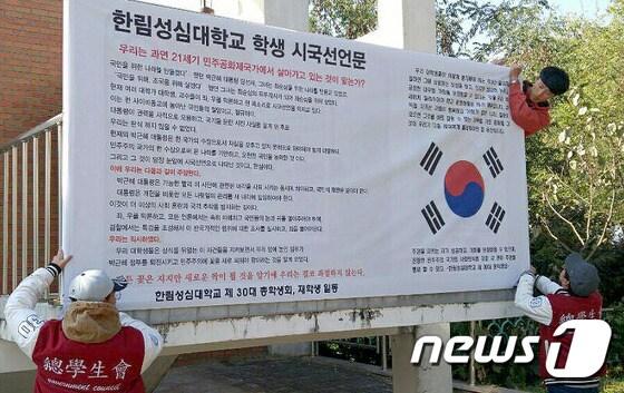 2일 오후 강원 춘천시 한림성심대학교는 교내에서 '우리가 과연21세기 민주공화제국가에서 살아가고 있는 것이 맞는가'라는 제목으로 시국선언 대자보 활동을 벌였다.2016.11.2(한림성심대학교제공)/뉴스1 ⓒ News1 박태순 기자