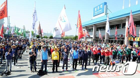 1일 오후 강원도 원주역 광장에서 열린 ‘세계노동절 127주년 강원지역 노동자대회’에서 최저임금 1만원, 비정규직 철폐, 재벌체제 해제를 촉구하며 참석자들이 힘차게 구호를 외치고 있다.2017.5.1/뉴스1ⓒ News1