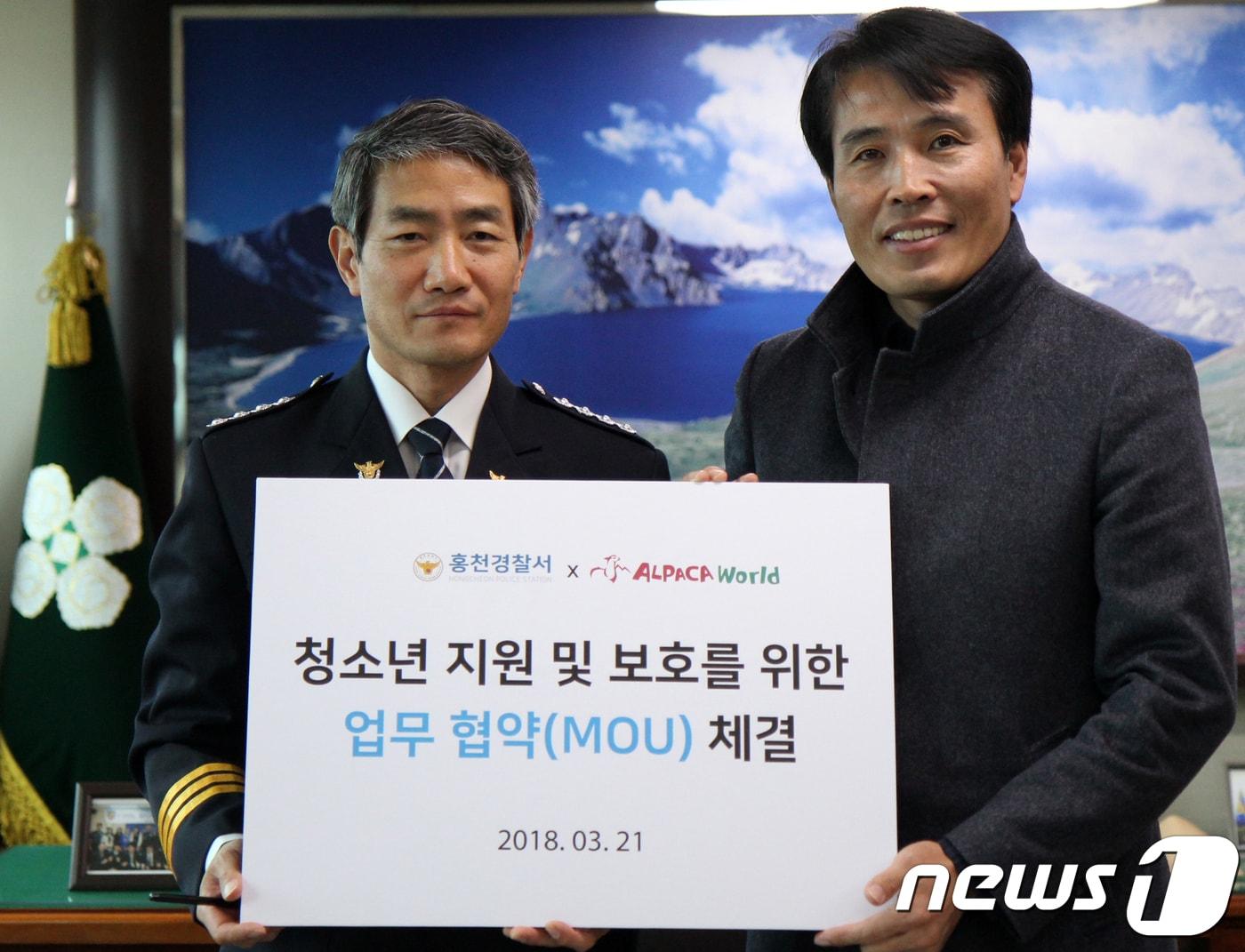 21일 오전 홍천경찰서에서 김진환 홍천경찰서장과 허영철 알파카월드 사장이 위기청소년 지원 및 보호를 위한 업무협약을 체결하고 있다. (홍천경찰서 제공) 2018.3.21/뉴스1 ⓒ News1 하중천 기자관련 키워드홍천경찰서관련 기사수만명 몰린 홍천강 축제서 미아…경찰, 15분 만에 가족 인계강원도, 위급한 순간 생명 구한 선행 의인 5명에게 도지사 표창홍천경찰서, 보이스피싱 피해 예방한 홍천 농협 직원에 감사장홍천군, 수능 이후 청소년유해환경 합동 집중 점검'용인 오피스텔 지인 여성 보복살해' 30대, 재판서 "혐의 인정"