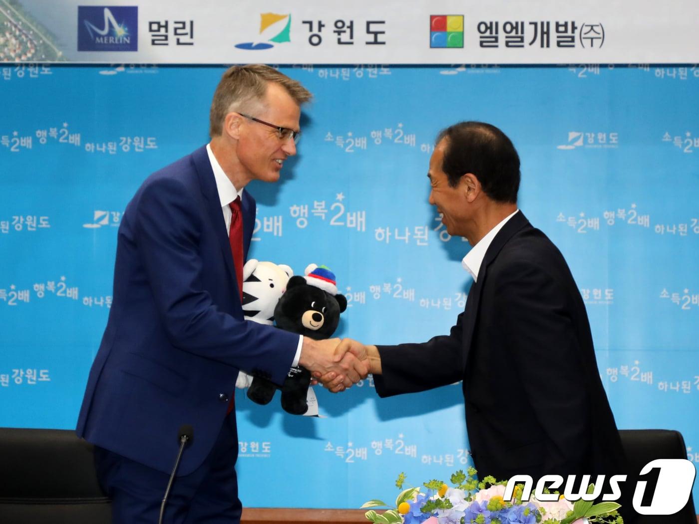 14일 강원도청 본관회의실에서 레고랜드 코리아 상생협력 합의서 체결식이 열린 가운데 최문순 강원도지사(오른쪽)가 올림픽 마스코트인 수호랑·반다비 인형을 멀린 존 야콥슨 총괄사장에게 전달한 후 악수를 하고 있다. 2018.5.14/뉴스1 ⓒ News1 하중천 기자관련 키워드레고랜드멀린강원도관련 기사레고랜드, 임시 대표 체제 돌입…실적·재정 '미완의 테마파크''우리 애 난리난 닌자고'…세계 처음 춘천 레고랜드에 떴다강원시민사회 "강원중도개발공사·강원개발공사 합병 중단하라"