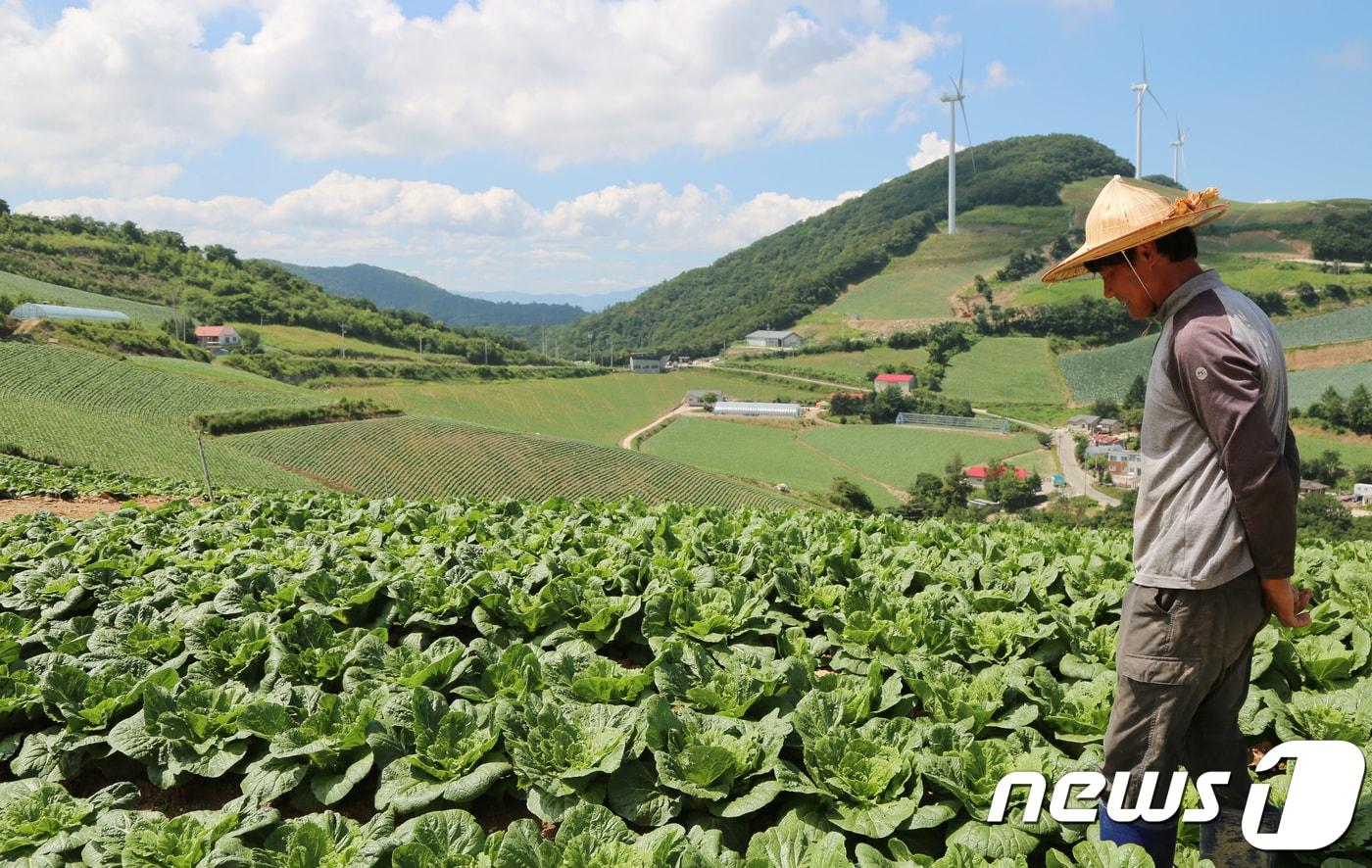 1일 강원 평창군 대관령면 횡계리와과 강릉시 왕산면 대기리 안반데기마을에서 여름배추 농사를 하는 김관영씨가 배추 생육상태를 살펴보고 있다. 김씨는 "앞으로 일주일 안에 비가 와야 배추가 잘 자랄 수 있다"고 걱정했다. 지난 달 폭염이 이어지면서 일부 농가에서는 배추가 볕에 타 고사되는 등 피해가 발생하기도 했다.2018.8.1/뉴스1 ⓒ News1 권혜민 기자