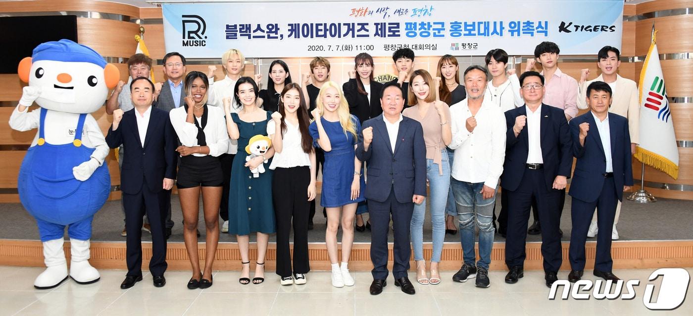 한왕기 평창군수를 비롯한 관계자들이 7일 강원 평창군청 대회의실에서 열린 2020년 2차 평창군 홍보대사 위촉식을 가졌다. 군은 SNS에서 세계 팬들에게 큰 주목을 받은 태권도 퍼포먼스 팀 케이타이거즈 제로(KTIGERS ZERO)와 다국적 아이돌 그룹인 블랙스완을 홍보대사로 위촉했다. (평창군청 제공) 2020.7.7 /뉴스1 ⓒ News1