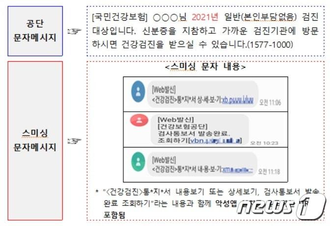 국민건강보험공단이 발송하는 건강검진 안내 문자메시지와 국민건강보험을 사칭한 스미싱 문자메시지 비교 자료. (국민건강보험공단 제공) 2021.11.25/뉴스1신관호 기자 '2년 만에 인구↑' 정선군, 강원랜드 배당 중심 '기본소득' 본격화'라인댄스 수강료가 왜 4만 원이야?'…원주 단계동에 무슨 일이