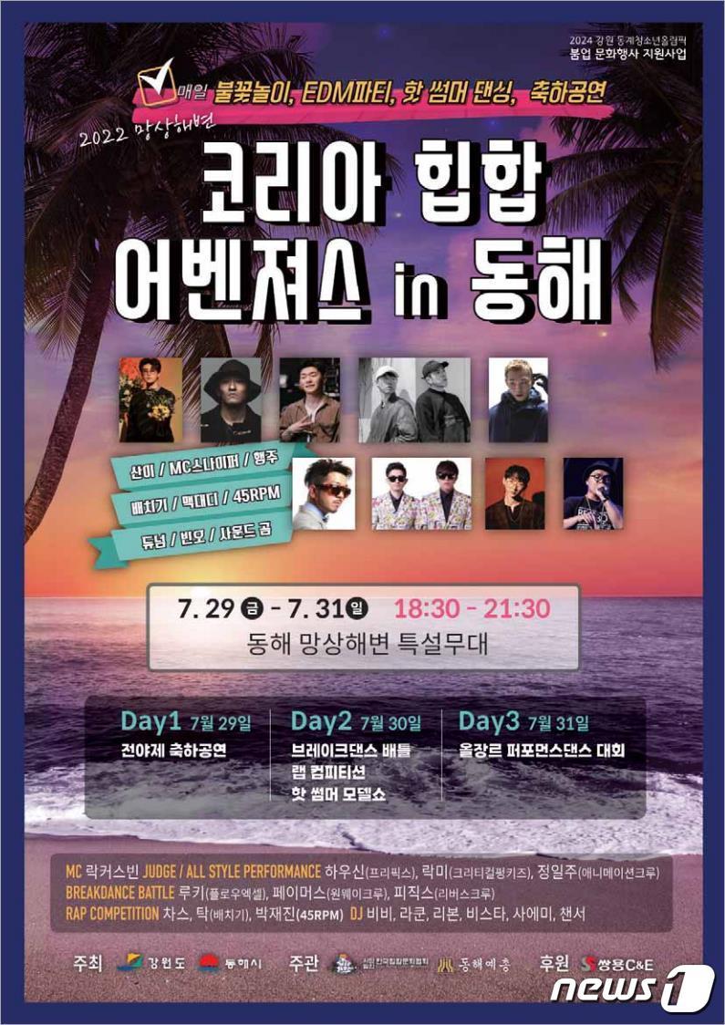 29~31일 망상해변 '코리아 힙합어벤져스 in 동해'30일 하조대에선 ‘하조대해수욕장 썸머페스티벌’코리아 힙합 어벤저스 in 동해 홍보 리플릿.(동해시 제공) 2022.7.28/뉴스12019년 양양 하조대 썸머 페스티벌(뉴스1 DB)윤왕근 기자 동해시, 결식 우려 아동 급식 단가 인상…방학 중 1일 1식 지원동해페이 캐시백 102억 '역대 최대'…지역경제 '훈풍'
