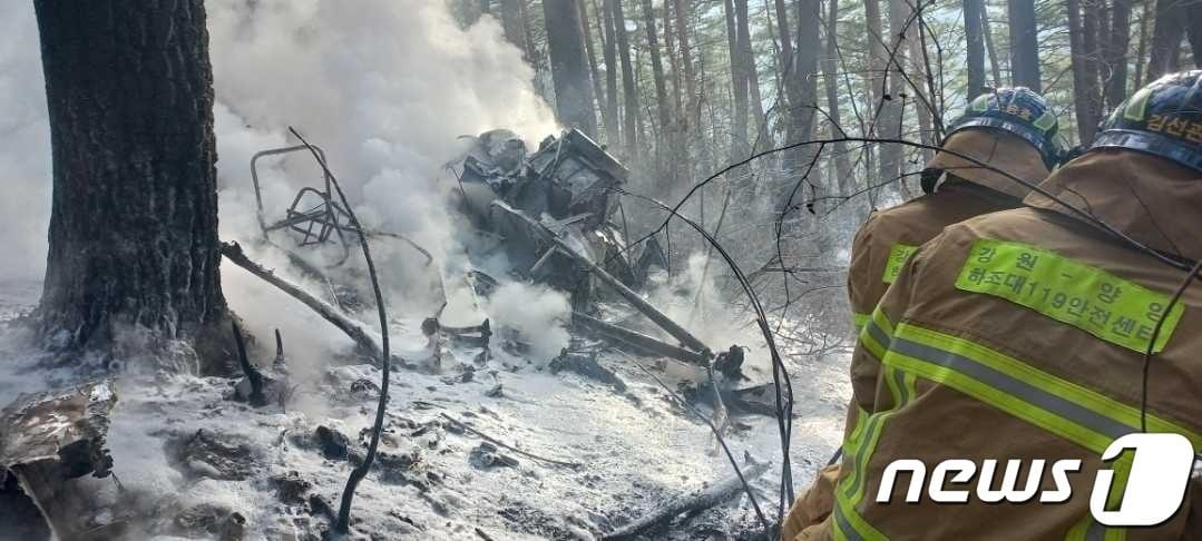 산불 계도 비행 중 추락한 헬기 사고로 5명이 숨진 27일 강원 양양군 현북면 명주사 인근 추락 현장에서 소방대원들이 화재를 진화하고 있다. (강원도소방본부 제공) 2022.11.27/뉴스1