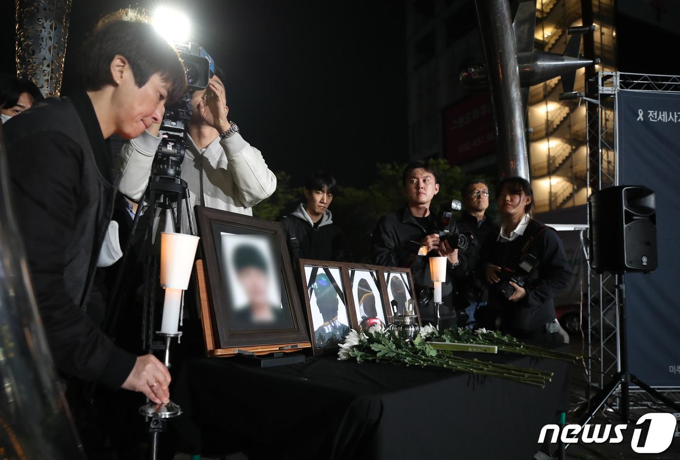 전세사기·깡통전세 문제 해결을 위한 시민사회대책위원회 관계자들이 18일 인천 주안역 남부광장 분수대로에서 정부의 전세사기 피해 대책마련을 촉구하는 기자회견 후 전세사기로 극단적 선택을 한 피해자의 영정사진을 올려놓고 있다..2023.4.18/뉴스1 ⓒ News1 정진욱 기자